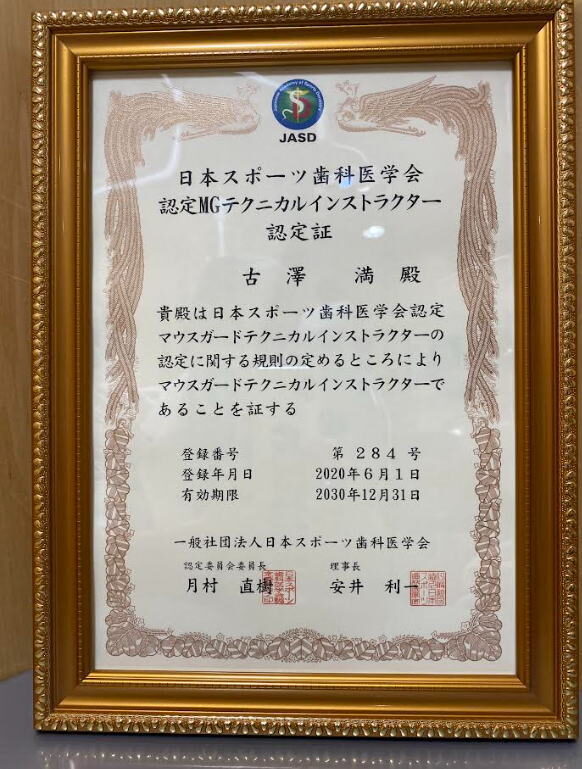 当院院長は、日本スポーツ協会公認スポーツデンティストおよび、一社)日本スポーツ歯科医学会認定 マウスガードテクニカルインストラクターの資格を取得しております。